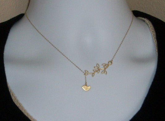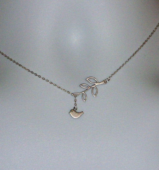 Tiny Lariat Necklace, Gold Filled Lariat Necklace with Gold Plated Branch and Gold Plated Tiny Bird Necklace, Bridesmaid Gift,