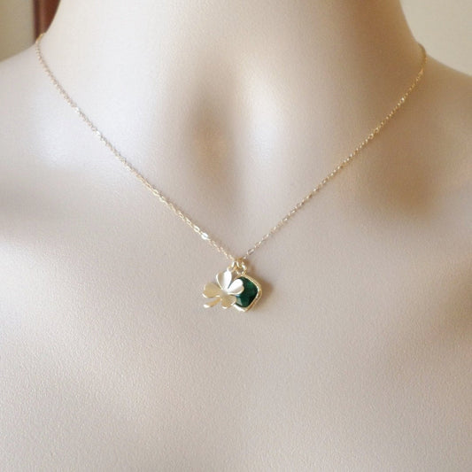 Gold Four Leaf Clover and Emerald Necklace - Clover Necklace - Gold Good Luck Necklace - Cluster Necklace - Valentines Day