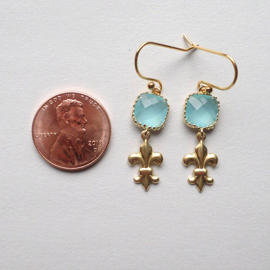 Mint Framed Glass and Fleur-de-lis Chandelier Earrings - Mint Green Earrings - Gold Earrings - Graduation Present - Christmas Gift