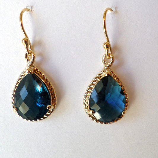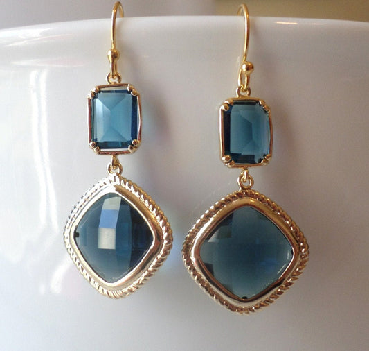 Only One Available - Montana Blue Framed Glass Gold Chandelier Earrings - Dark Blue Earrings - Gold Earrings - Christmas Gift