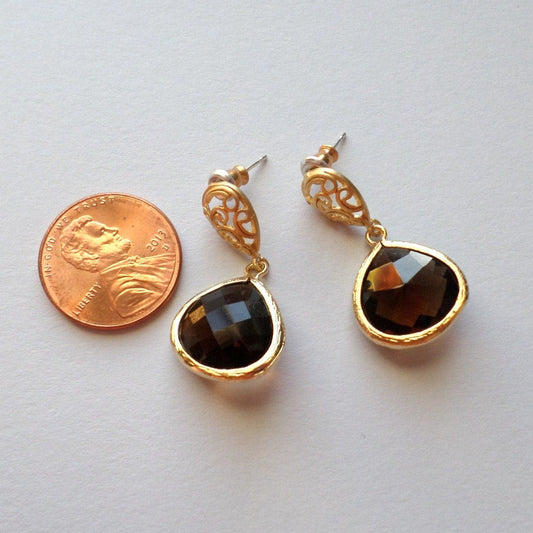 Only One Available - Smokey Framed Glass Drop Earrings - Brown and Gold Earrings - Post Earrings - Graduation Present - Christmas Gift