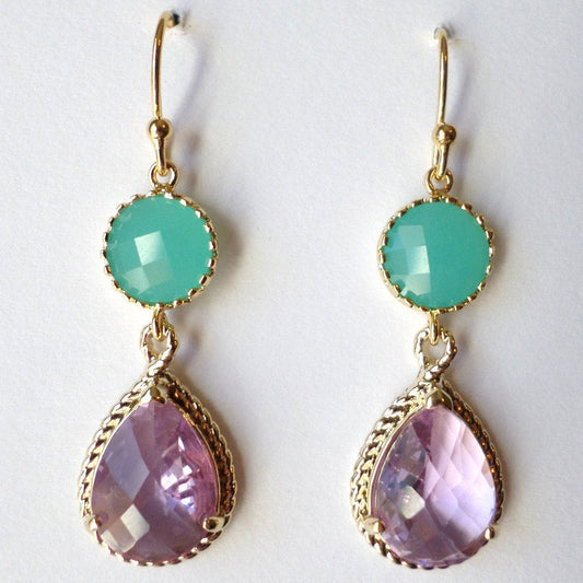 Lavender and Mint Framed Glass Chandelier Earrings - Lavender Earrings - Gold Earrings - Graduation Present - Valentines Day