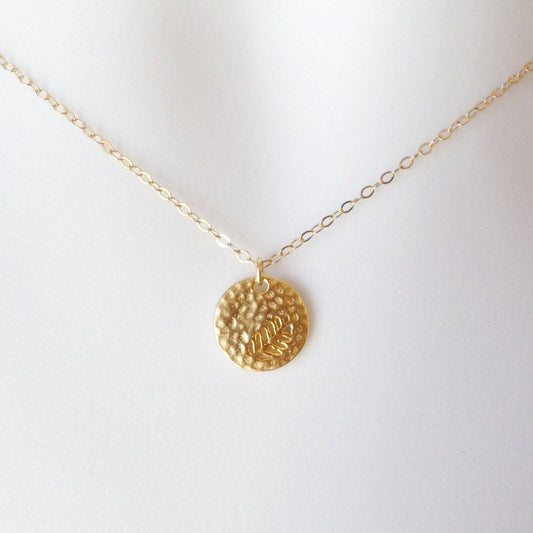 Gold Disc Necklace, fern leaf cutout disc charm necklace, Tiny Gold Filled Hammered Disc with Fern Leaf Cutout Necklace, Valentines Day