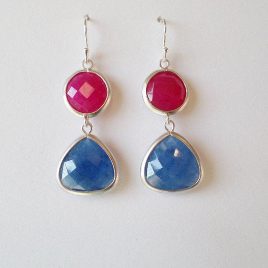Blue Sapphire and Ruby Gemstone Silver Chandelier Earrings - Blue Earrings - Red Earrings - Silver Earrings - Mothers Day Gift