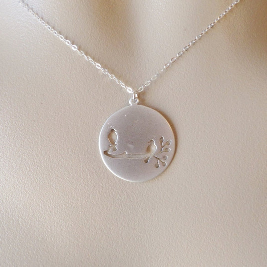 Silver Disc Necklace, Birds on Branch Disc Charm Necklace, Rhodium Plated and Sterling Silver necklace - Valentines Day Gift